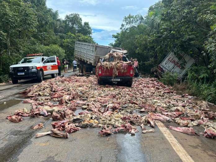 Restos de carne são espalhados pela pista após acidente na BR-010